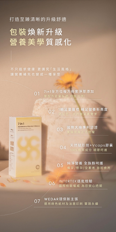 🌟選用美國專利葉黃素,搭配專業大廠玉米黃素,皆是游離型態,複方黑醋栗提升水潤、美國藻紅素、沙棘籽萃取、天然酵母鋅、天然酵母硒,更升級米糠賦形劑,打造全方位7in1美國專利游離型葉黃素,每日一顆滿足所需。
