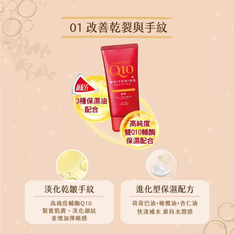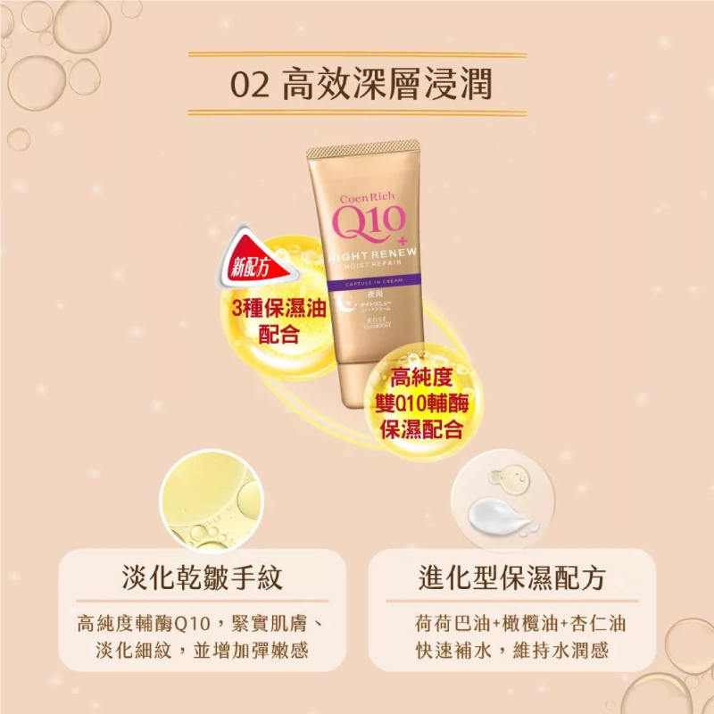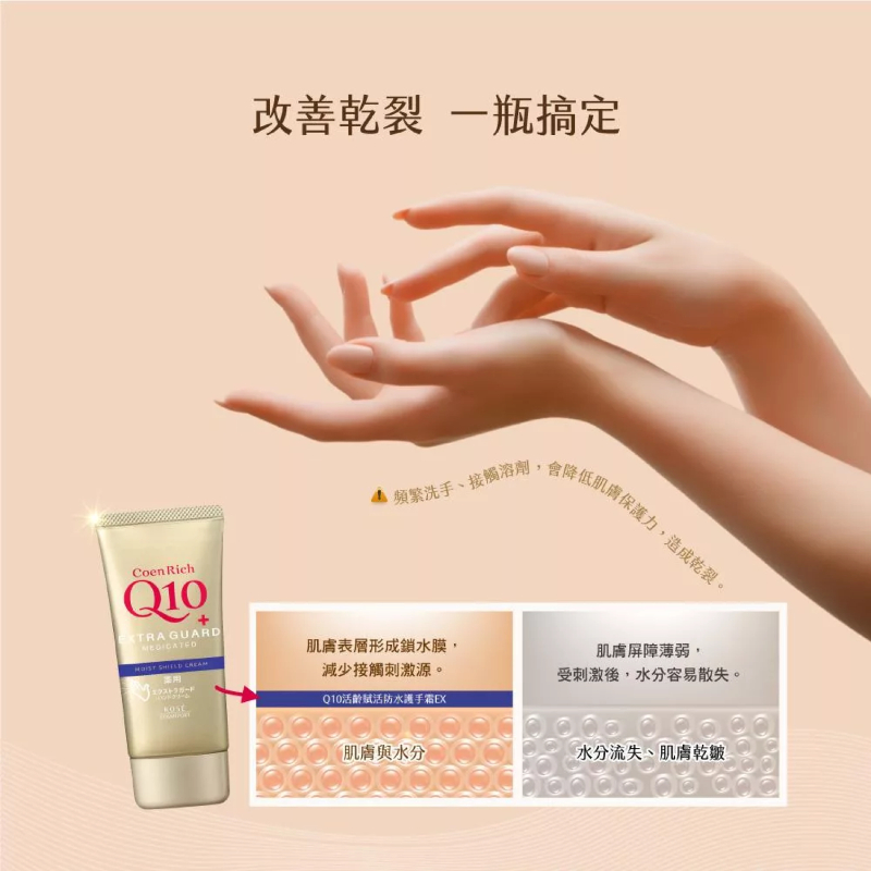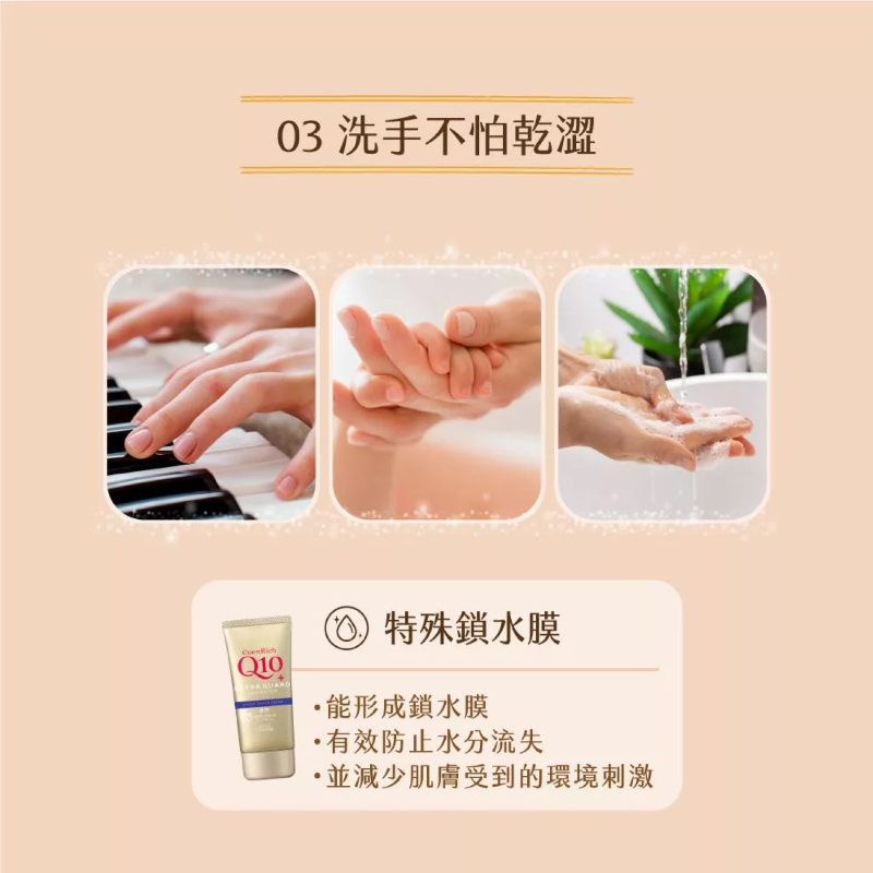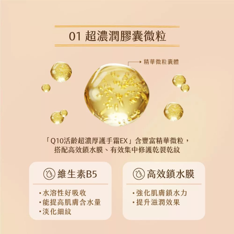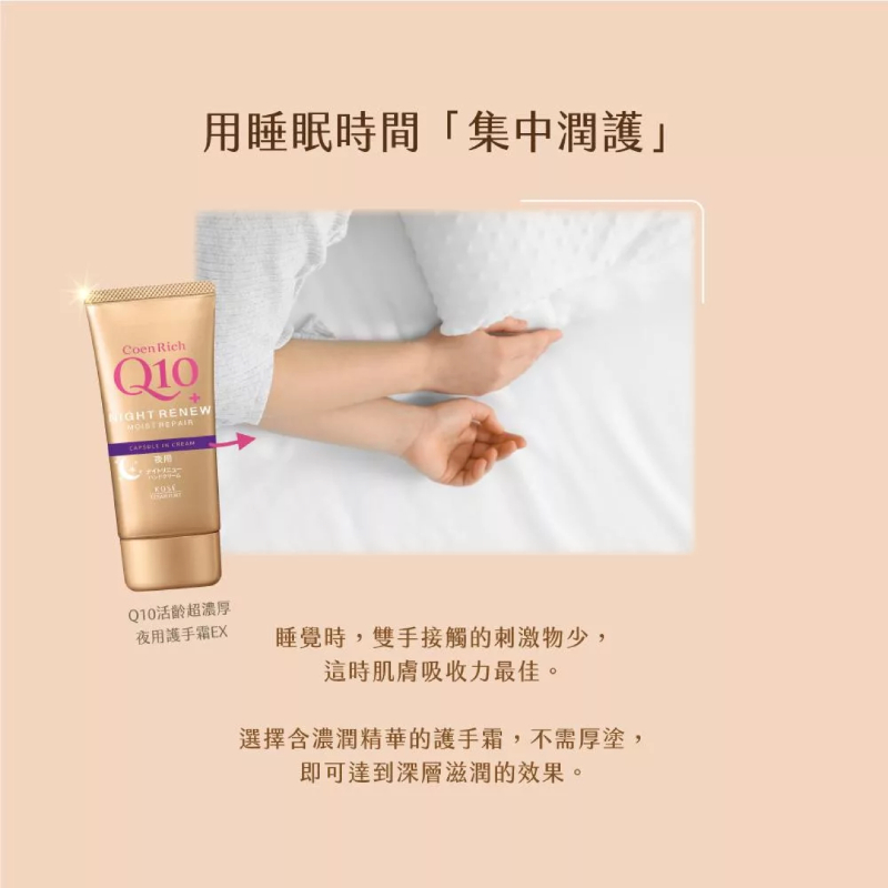 👑推薦:晚上搭配Q10活齡超濃厚夜用護手霜,超濃厚保濕精華,睡覺也能持續修護手肌。給雙手24h完整呵護、改善手肌龜裂問題。