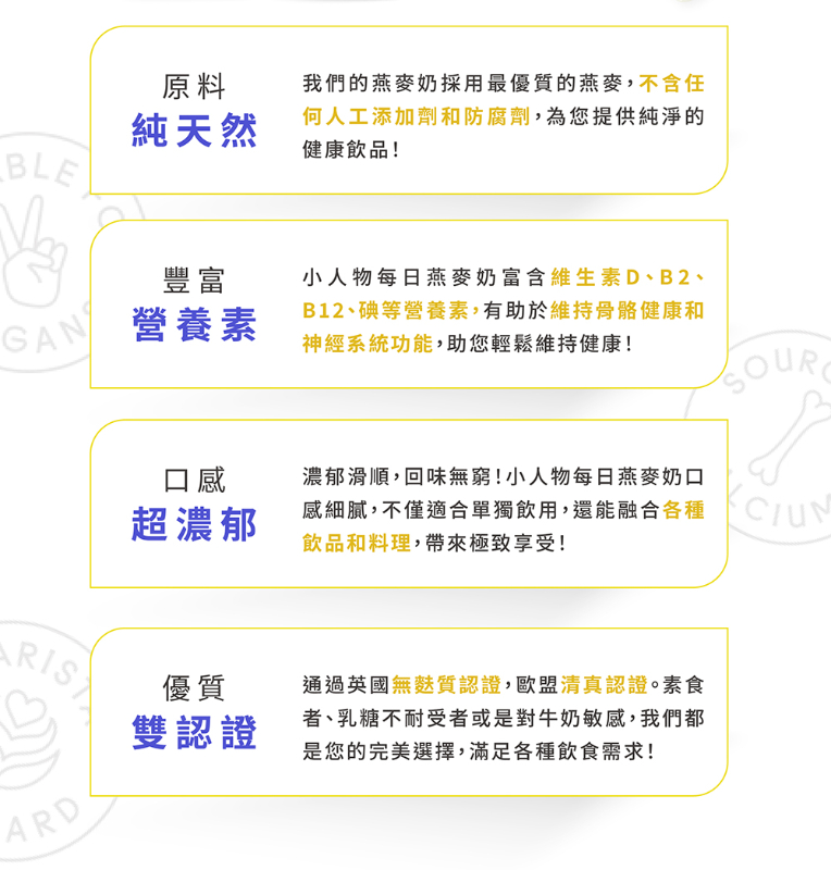 🌟豐富營養:每一口都是營養的擁抱!小人物每日燕麥奶富含維生素D、B2、B12、碘等營養素,有助於維持骨骼健康和神經系統功能,助您輕鬆維持健康!