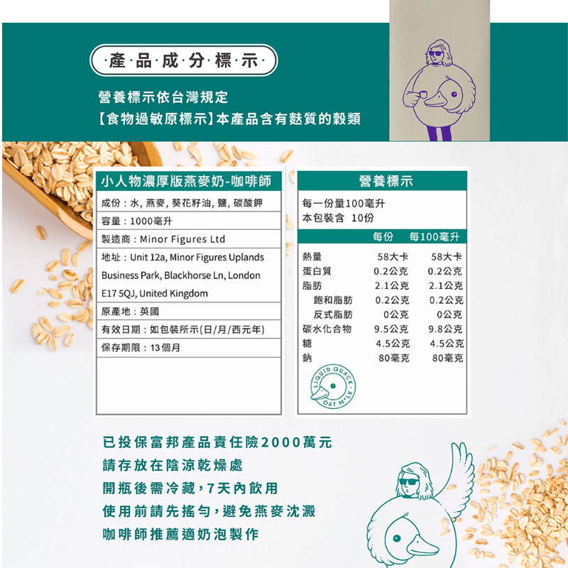 🌟適合多種飲食需求:無論您是素食者、乳糖不耐或是對牛奶敏感的消費者,小人物每日燕麥奶都是您的完美選擇,滿足各種飲食需求!探索全新的健康味覺體驗!活力充沛,美味無限!