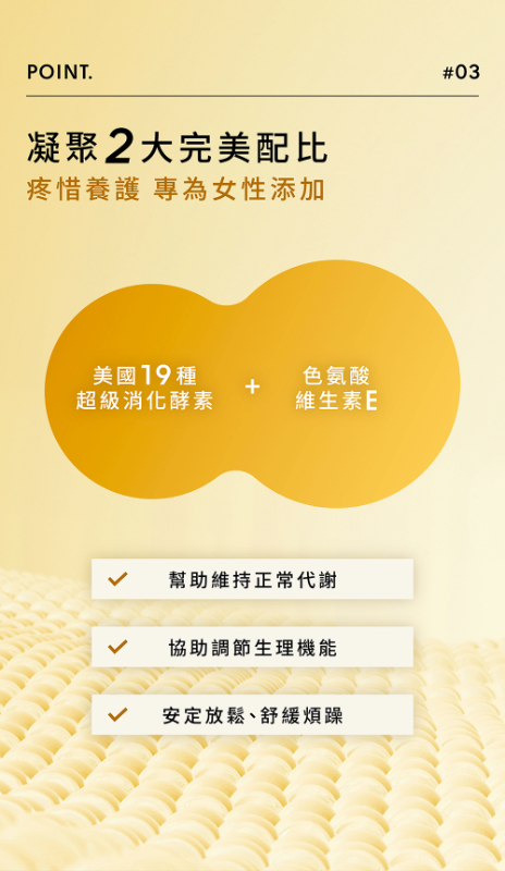 🔹成分:芝麻素抽出物[D-山梨醇(甜味劑)、芝麻抽出物(含芝麻素)]、麥芽糊精、微結晶纖維素、色胺酸、蜂王乳凍乾粉(生鮮蜂王乳、β環狀糊精)、維生素E[乙酸dl-α生育醇酯(維生素E)、麥芽糊精、辛烯基丁二酸鈉澱粉、二氧化矽]、基礎型綜合消化酵素n.zimes basic(蛋白酵素4.5、麥芽糊精、澱粉酵素、糖化酵素、脂解酵素、轉化酵素、鳳梨酵素、蛋白酵素3.0、纖維素分解酵素)、玄米穀物生酵素粉末[(玄米、黑糯米、蕎麥、大麥、白藜麥、紅藜麥、黑藜麥、小麥胚芽、薏仁、玉米)、荔枝、米糠、水蜜桃、諾麗果、蘋果、芭樂]、硬脂酸鎂、麩胺酸發酵物(含GABA)[氧化澱粉、麩胺酸發酵物]、二氧化矽、維生素B6、膠囊殼(明膠、二氧化鈦、甘油、硫酸月桂酯鈉、食用黃色四號、食用黃色五號、純水)