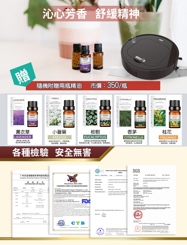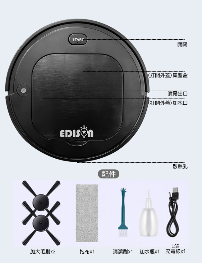 內 容 物:主機×1、產品說明書×1、加大毛刷×2、充電線×1、魔術貼×3、鎖水拖把布×1、加水瓶×1、清潔刷×1、香氛精油×2瓶(香味隨機)