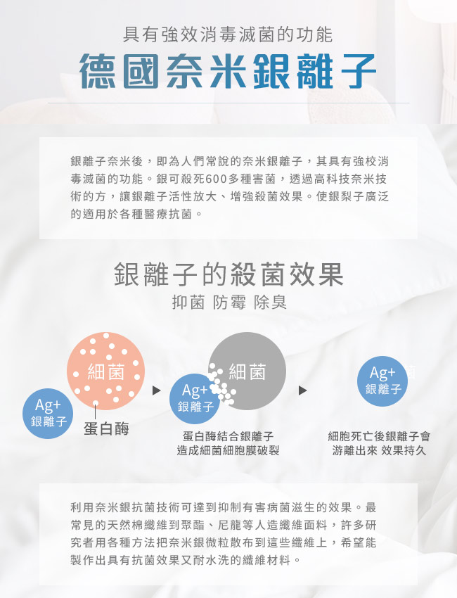 ◆表布100%萊賽爾100支紗及奈米銀離子,透氣抑菌防霉