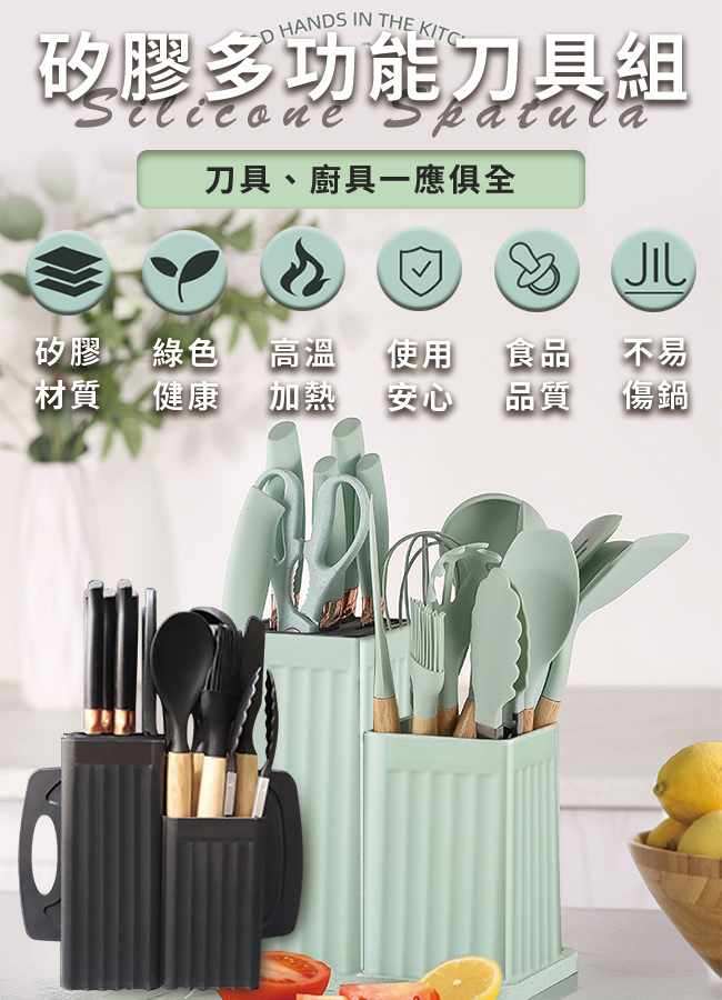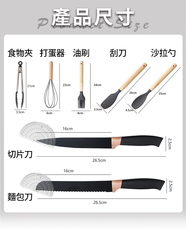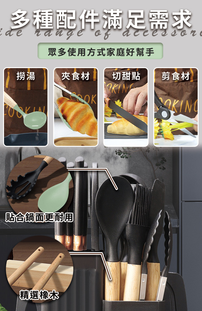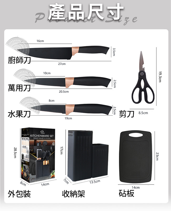 內容物:撈麵勺x1、湯勺x1、湯匙x1、漏湯匙x1、鍋鏟x1、漏鍋鏟x1、刮刀x1、沙拉勺x1、食物夾x1、打蛋器x1、油刷x1、切片刀x1、麵包刀x1、廚師刀x1、萬用刀x1、水果刀x1、剪刀x1、砧板x1、收納架x1