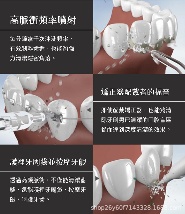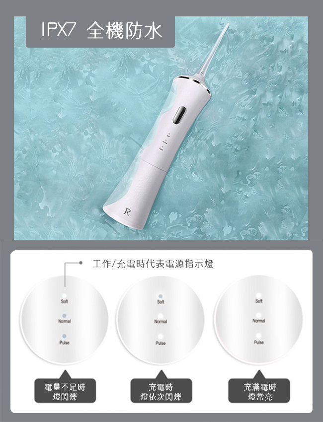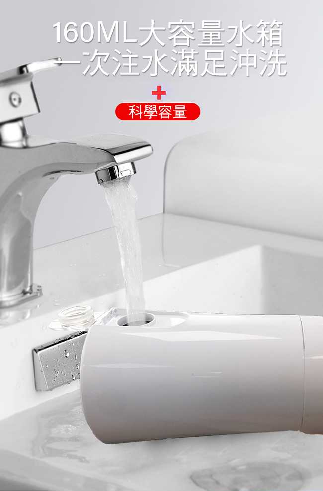 IPX7防水等級,全機身防水,無懼水洗,160ml大容量水箱,高頻脈沖,三段強度選擇,強勁沖洗