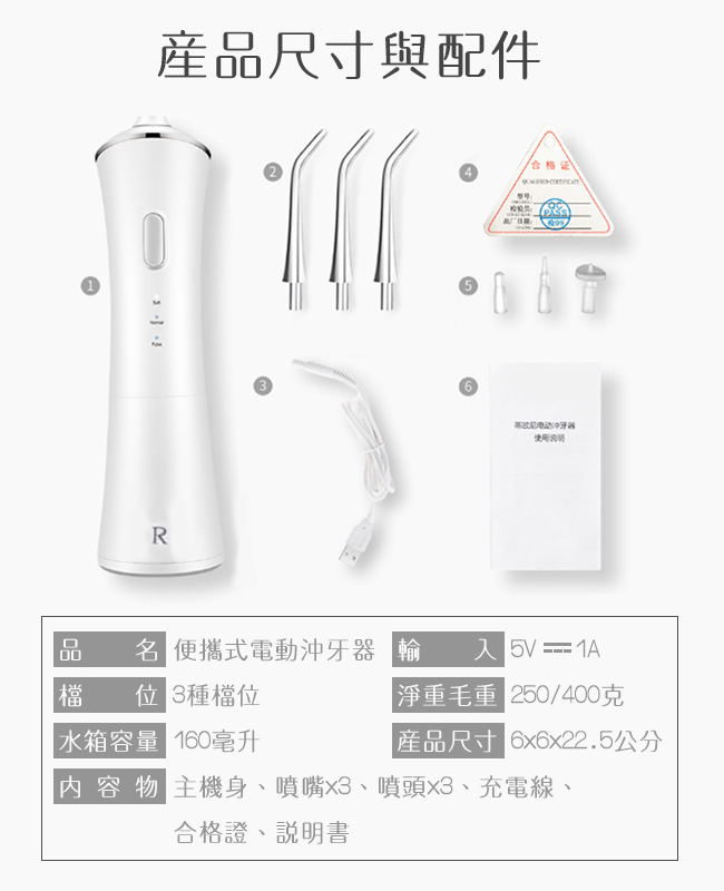 內 容 物:主機身、噴嘴×3、噴頭×3、充電線、合格證、說明書