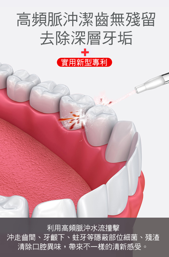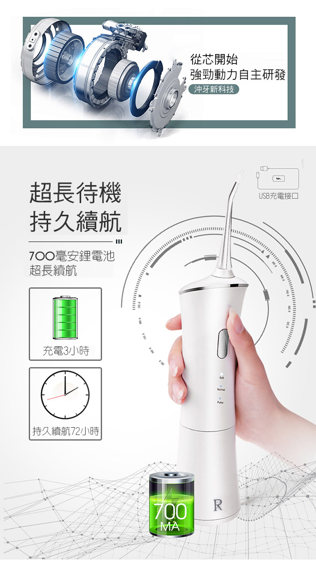 700毫安鋰電池,搭配高頻率水柱,沖勁十足 ,超深度清潔牙齦根部與齒縫