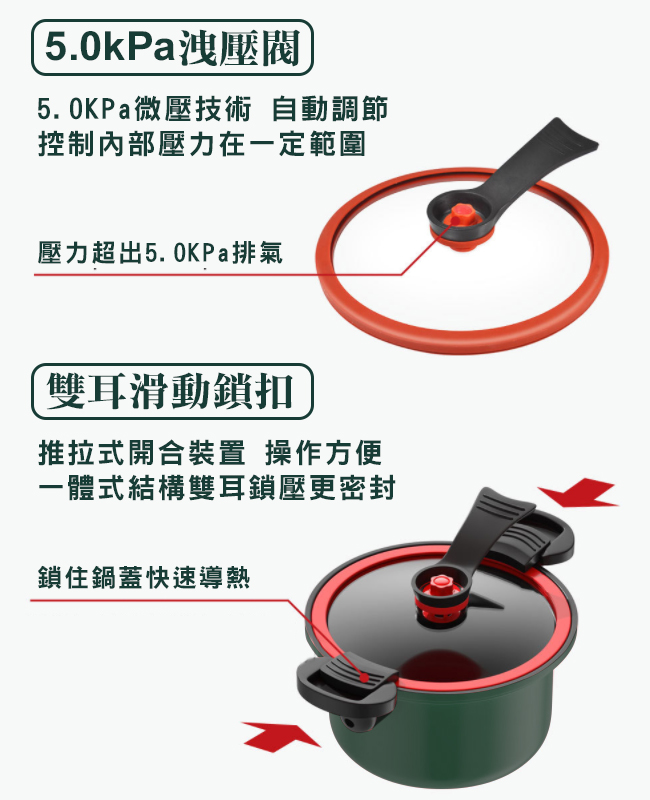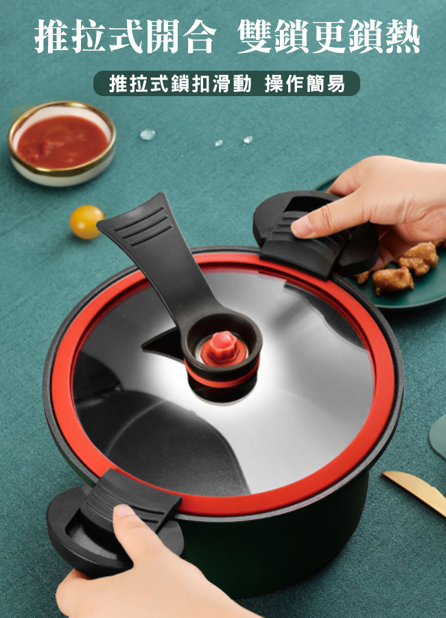 ●食品級密封圈無縫貼合鍋蓋,密封更嚴實。節能省時,雙耳鎖壓一體結構更鎖熱,