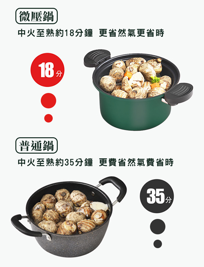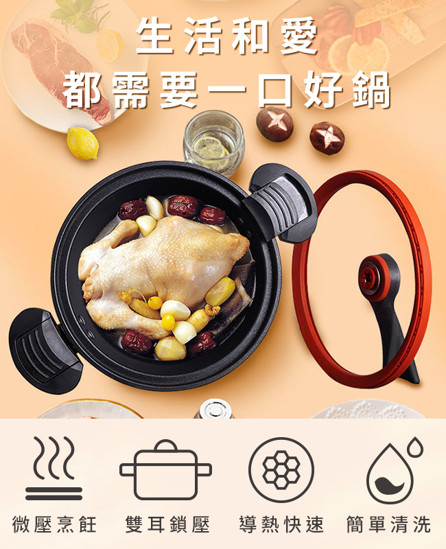 創新微壓技術,安全壓力快速導熱、食材營養不流失,純物理不沾塗層,健康烹飪安心。