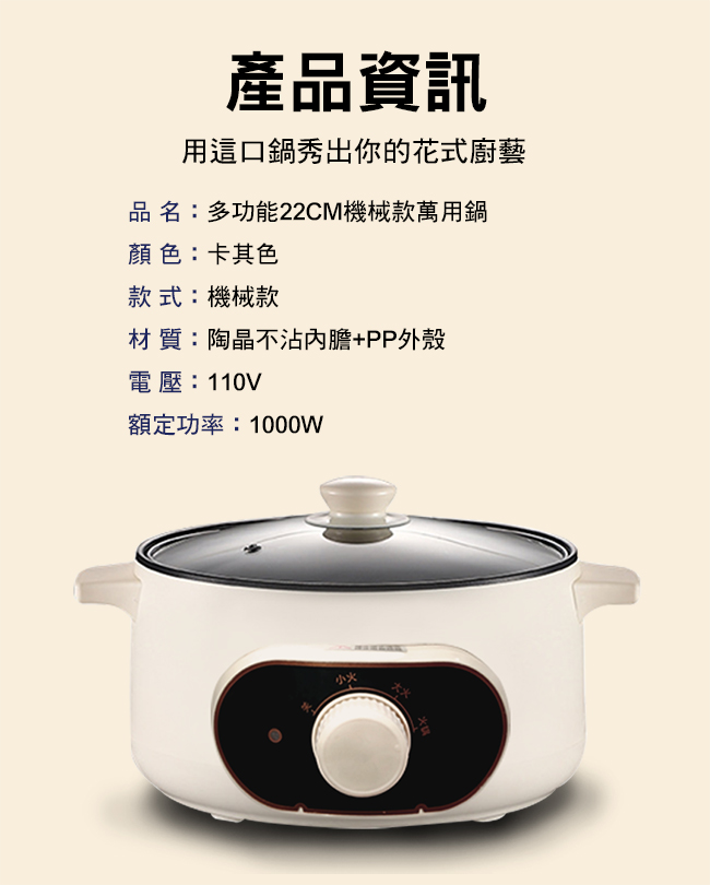 內 容 物:電煮鍋機身×1、鍋蓋×1、電線×1