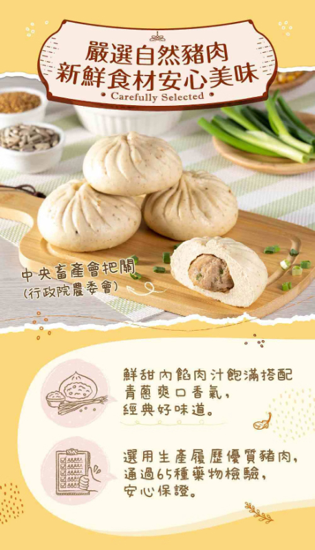 🌾嚴選擁有產銷履歷快樂豬,單一牧場畜養到餐桌,無用藥安心保證,210日齡成熟豬。加入新鮮青蔥,讓多汁美味內餡帶有蔥花香氣,經典百搭好滋味!