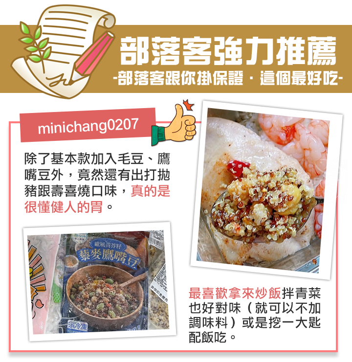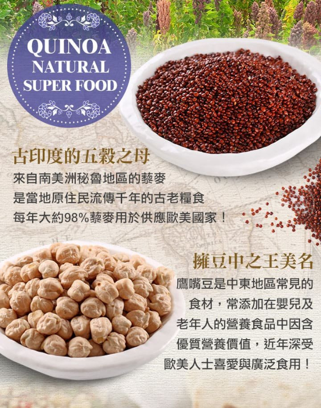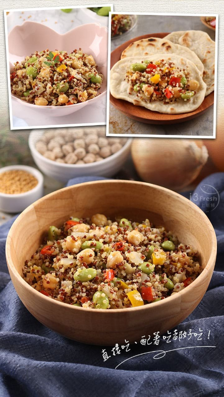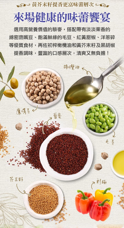 🔹產品成份:藜麥、洋蔥、鷹嘴豆、毛豆(非基因改造)、紅椒、黃椒、初榨橄欖油、糖、黃芥末籽、鹽、黑胡椒粒。