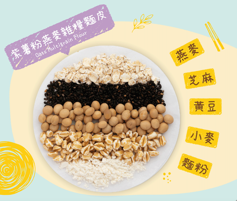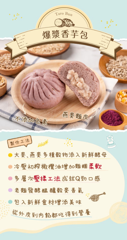 🌾紫薯穀麥外皮結合大甲檳榔心芋,12小時內新鮮蒸製作軟香甜內餡,加入芋頭顆粒,豐富口感巧妙搭配