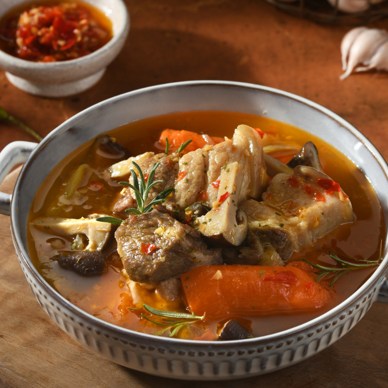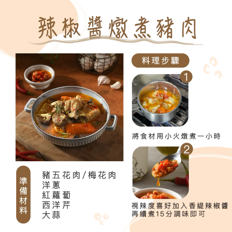 🐷香緹辣椒醬燉豬肉:切好的肉入鍋,加入香緹辣椒醬和高湯、與喜歡的蔬菜及馬鈴薯,燉煮至入味鬆軟,每一口都是滿滿的美味。