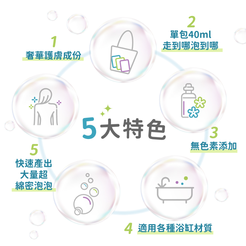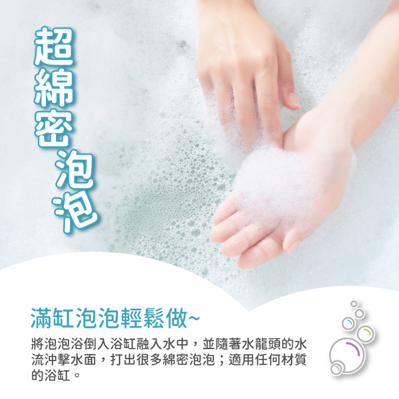 ✔打開水龍頭後,將包裝剪開倒入泡泡浴,讓蓮蓬頭(水龍頭)的水流衝擊水面可製造出綿細泡泡(沖刷力度越大泡泡越多),亦可用手攪拌起泡,即可享受護膚泡泡浴。