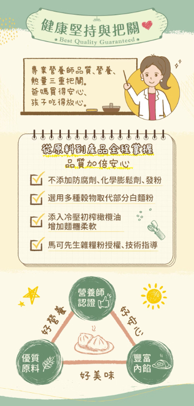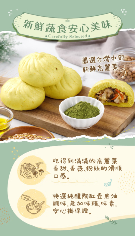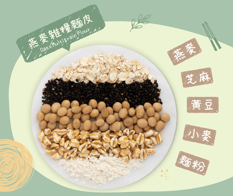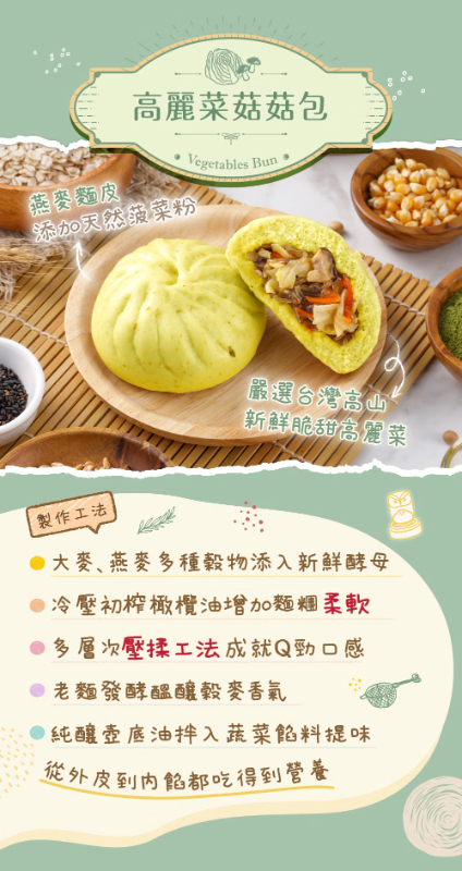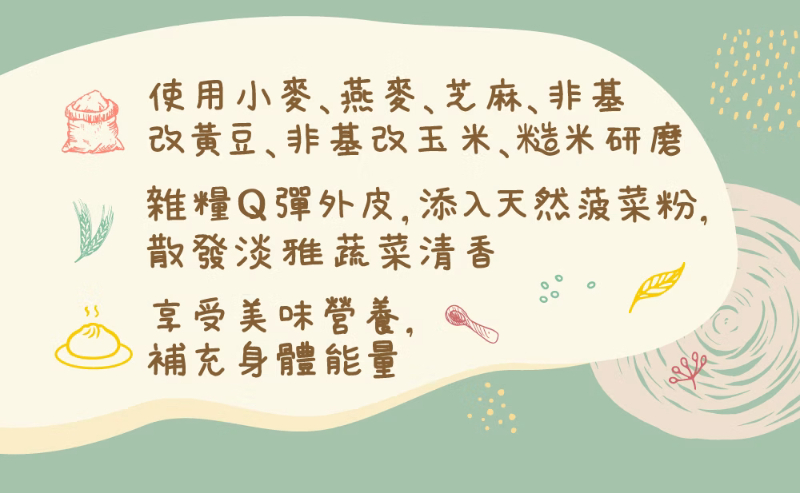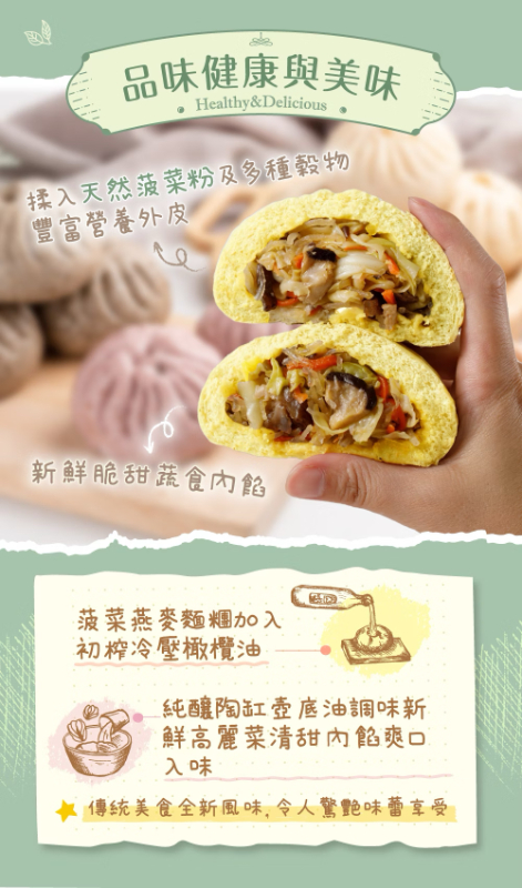 🌾大麥燕麥麵皮揉入菠菜粉,內餡選用當令台灣高山在地生產的新鮮高麗菜,與純釀陶缸壺底油調味,每一口都能吃到滿滿的蔬菜香甜味、香菇的營養、粉絲的滑順口感。
