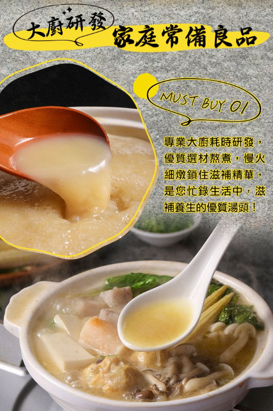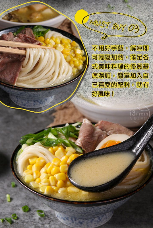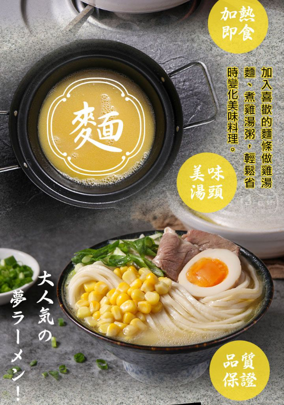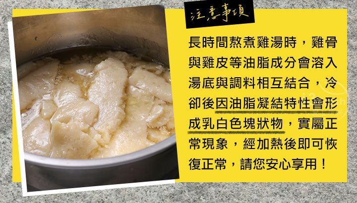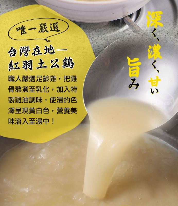 🔹產品成份:雞湯(水、土雞雞架)、調味料{水 、鹽、奶精[葡萄糖漿、氫化棕櫚核仁油、乳化劑(脂肪酸甘油酯、單及雙脂肪酸甘油二乙醯酒石酸酯)、乾酪素鈉、檸檬酸鈉、多磷酸鈉、磷酸氫二鉀、碳酸鈣]、豬骨濃湯粉[豬骨高湯(豬骨、水)、麥芽糊精、明膠]、豬油(西班牙)、白湯[高湯(雞骨、豬骨、水、鹽)、雞油、鹽、水、麥芽糊精]、L-麩酸鈉、糖、香料、雞油、明膠、玉米糖膠、刺槐豆膠、5'-次黃嘌呤核苷磷酸二鈉、5'-鳥嘌呤核苷磷酸二鈉}、調味料{水、鹽、雞肉萃取物 (雞肉萃取物、鹽) 、L-麩酸鈉、糖、雞油、酵母萃取物(酵母萃取物、鹽) 、乙醯化己二酸二澱粉、香料、調味劑(5'-次黃嘌呤核苷磷酸二鈉、5'-鳥嘌呤核苷磷酸二鈉) 、明膠、玉米糖膠、β-胡蘿蔔素[麥芽糊精、辛烯基丁二酸鈉澱粉、葵花籽油、抗氧化劑(L-抗壞血酸鈉、維生素C、維生素E) 、β-胡蘿蔔素]}、薑