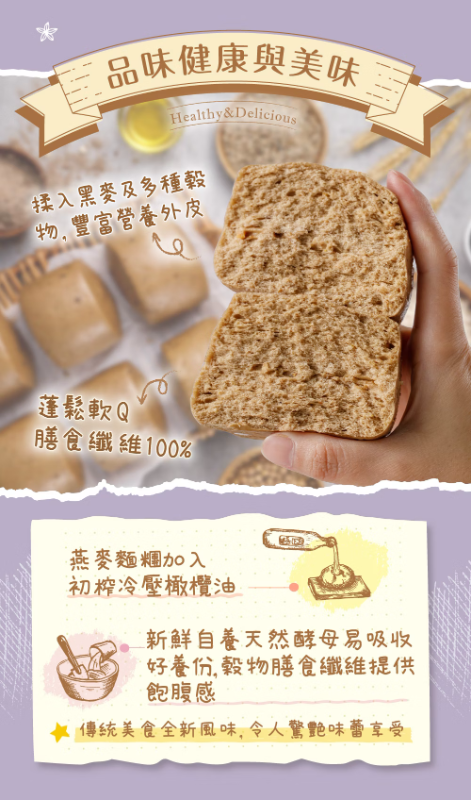 🌾黑麥瀰漫濃郁穀香,多種穀物的膳食纖維,讓飽足感更十足,無加糖微量油獨門配方,減輕負擔更健康!